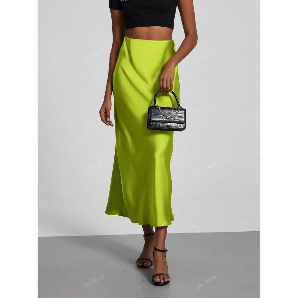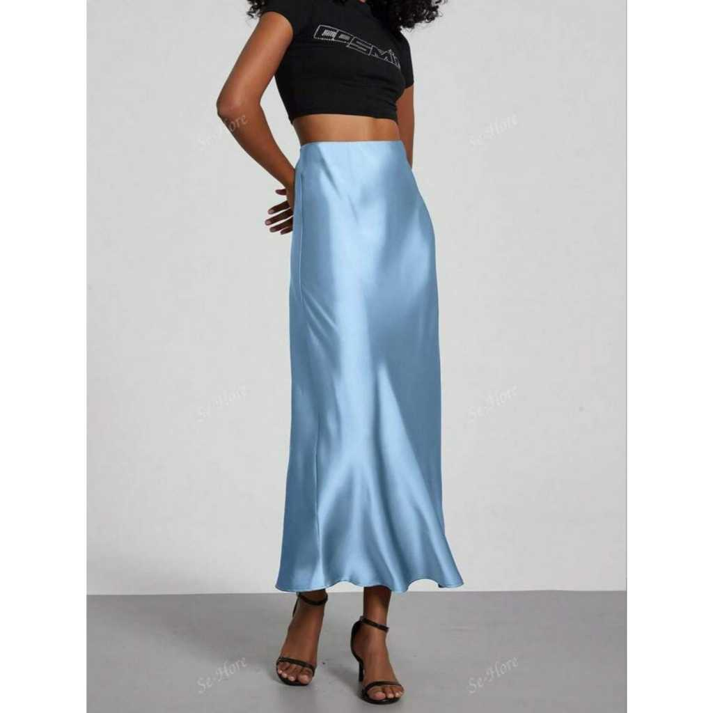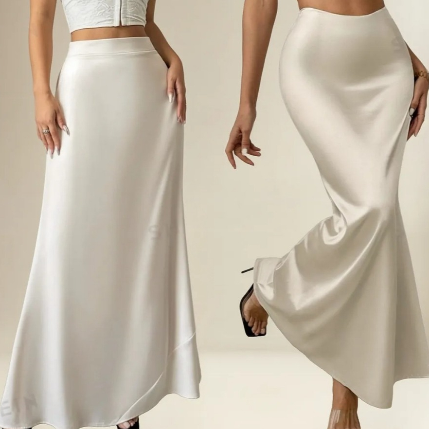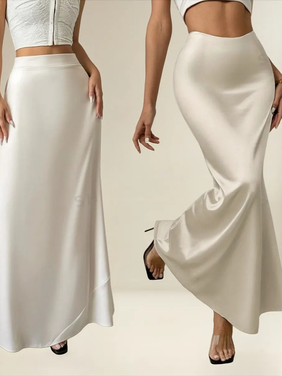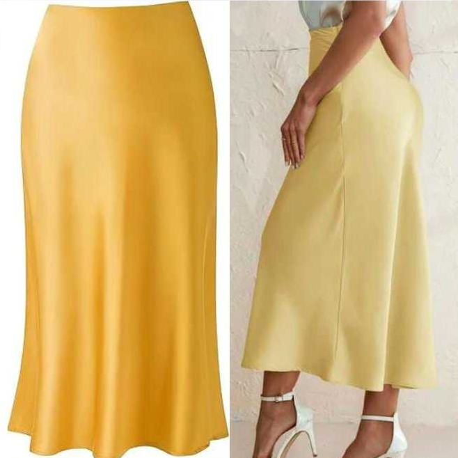 Saia elegante e versátil, confeccionada em cetim leve e com brilho sutil
