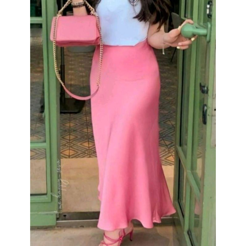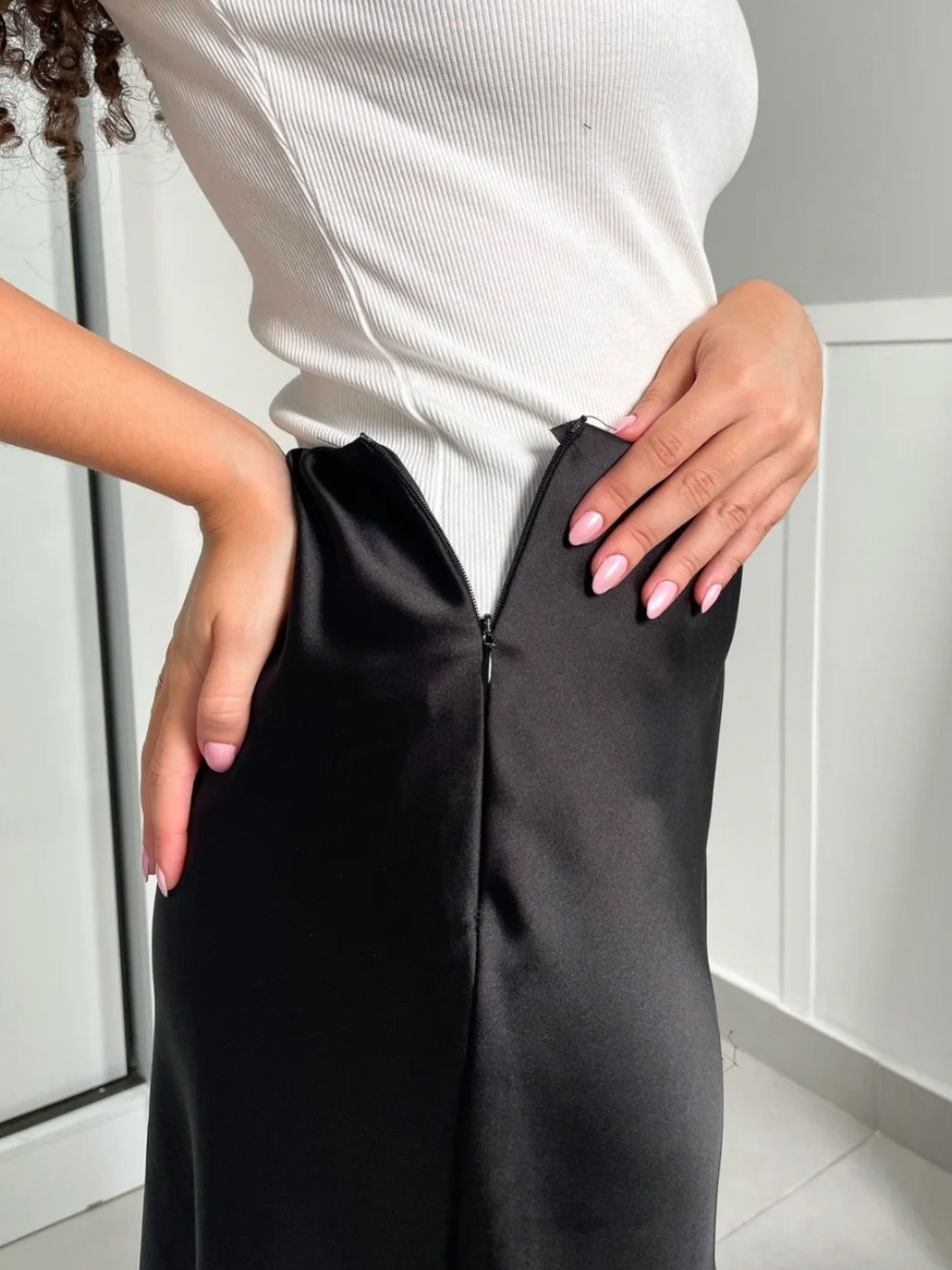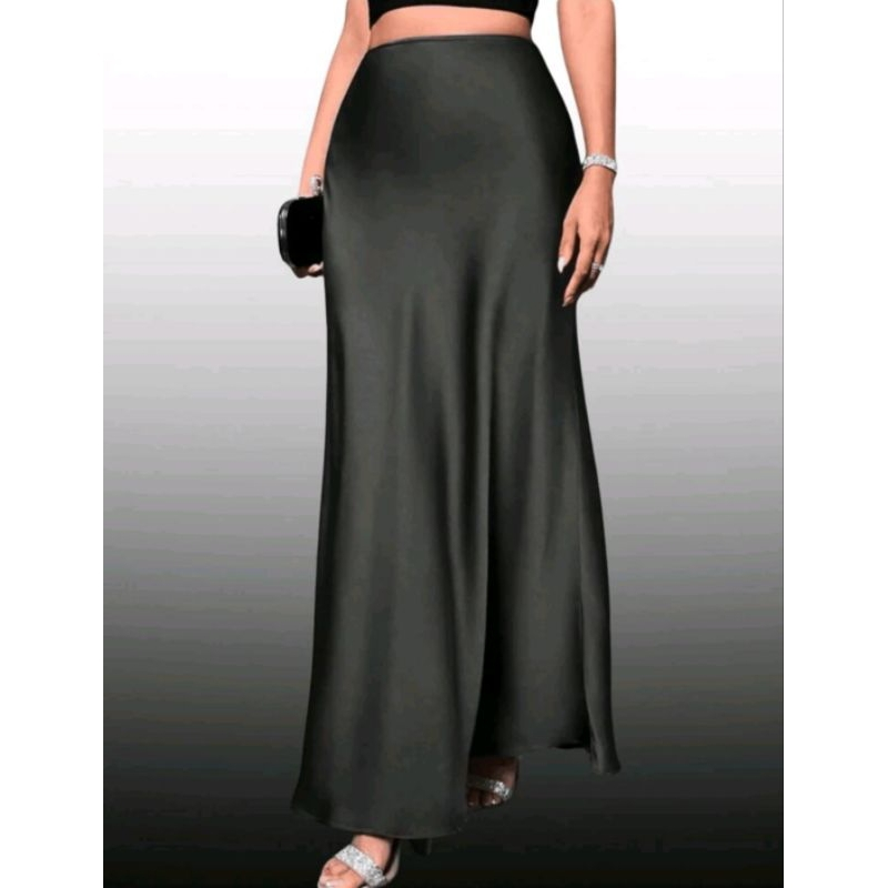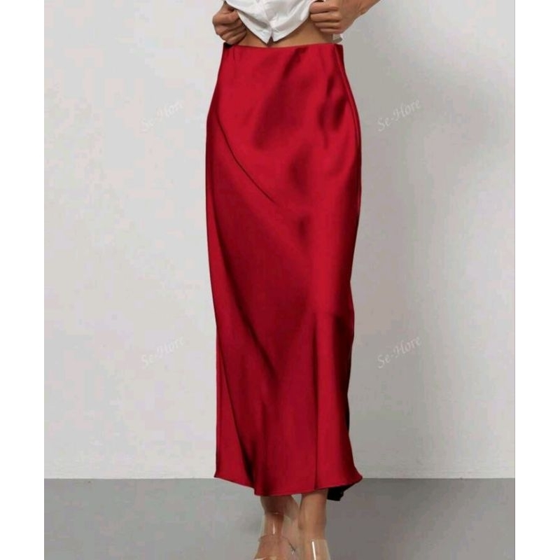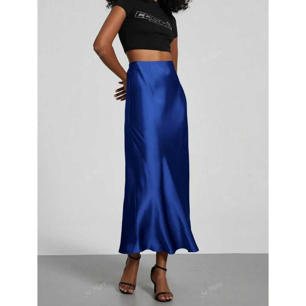Saia elegante e versátil, confeccionada em cetim leve e com brilho sutil