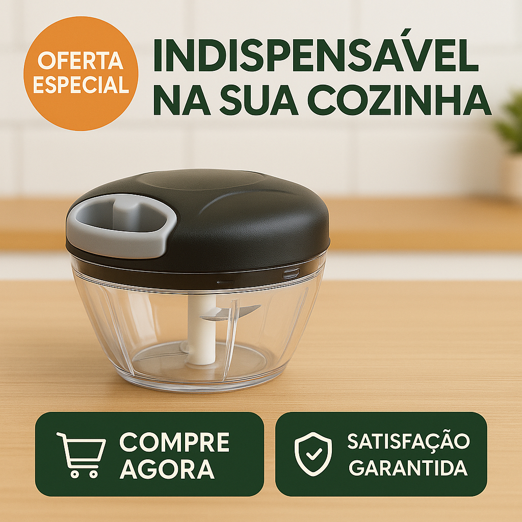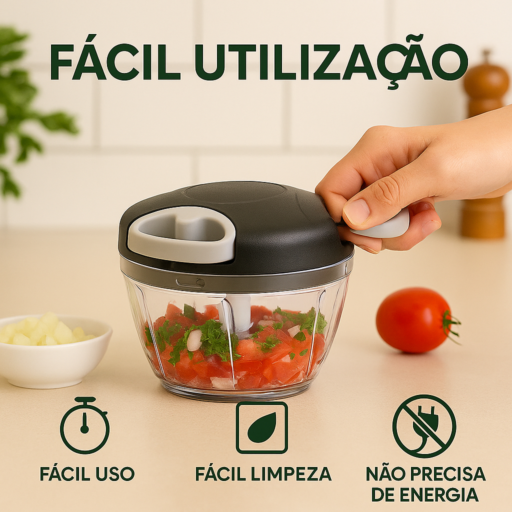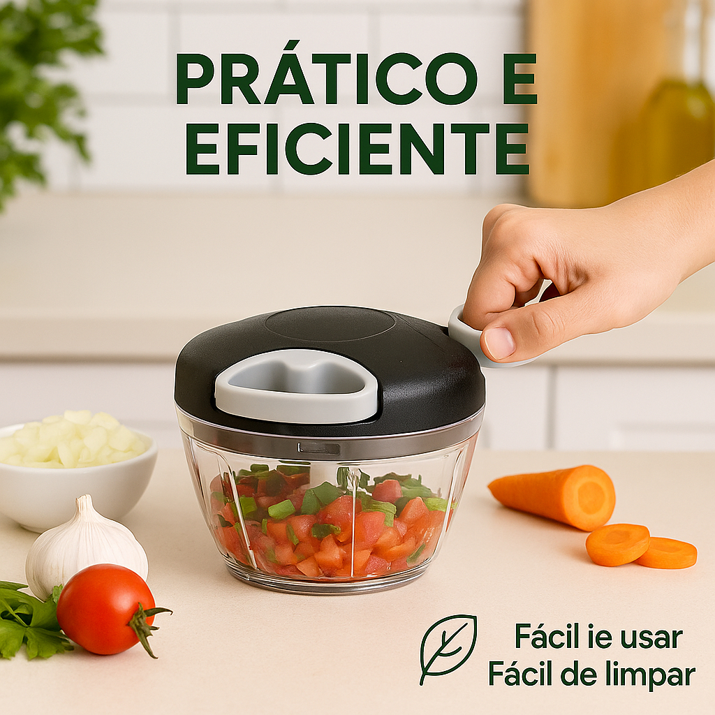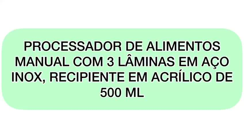 " O Processador é ideal para todos os tipos de legumes e verduras. Possui três lâminas giratórias em inox, acionadas manualmente por uma corda retrátil. Para evitar danos às lâminas, recomenda-se adicionar um pouco de água ou óleo ao processar alimentos secos. Sua montagem é simples e prática, permitindo picar os alimentos de forma muito mais fácil, rápida e sem bagunça. Além disso, ocupa pouco espaço, é resistente e fácil de limpar — perfeito para facilitar e agilizar o dia a dia na cozinha. Peça ja o seu!"