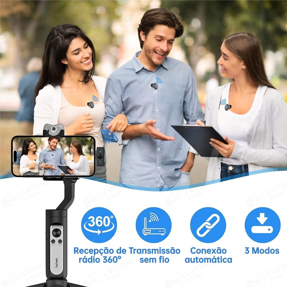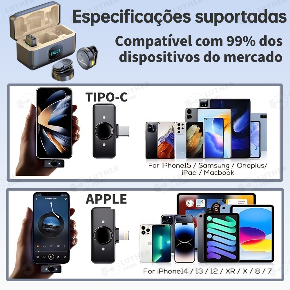 Este microfone de lapela sem fio vem acompanhado de receptor Tipo-C e adaptador Lightning, garantindo compatibilidade com a maioria dos telefones Android e iOS.