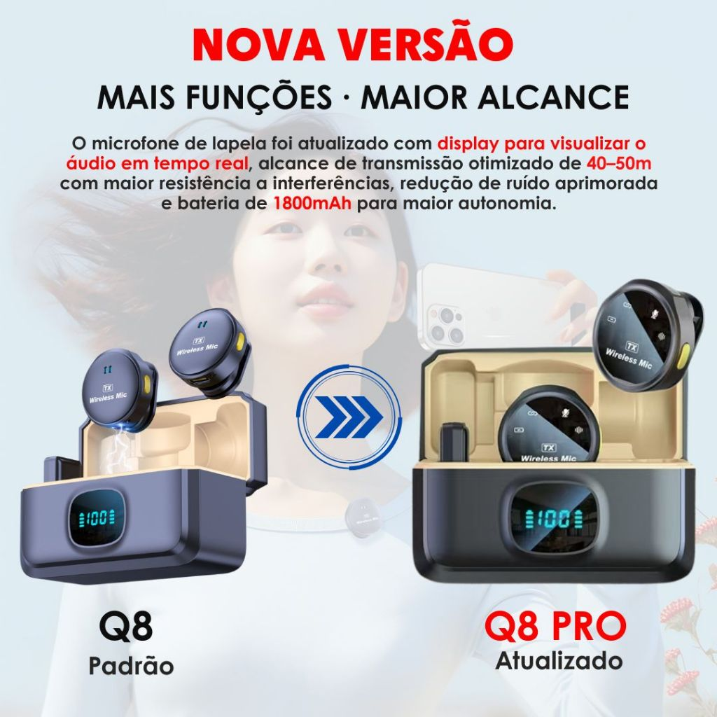 🔋 Bateria de Longa Duração – Microfones com 80mAh + case 1800mAh.